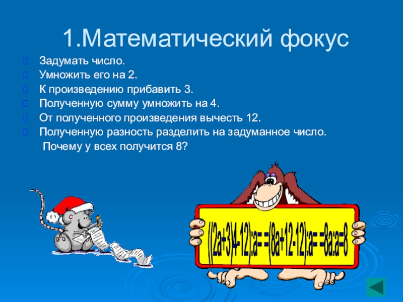 1.Математический фокусЗадумать число.Умножить его на 2.К произведению прибавить 3.Полученную сумму умножить на 4.От полученного произведения вычесть 12.Полученную