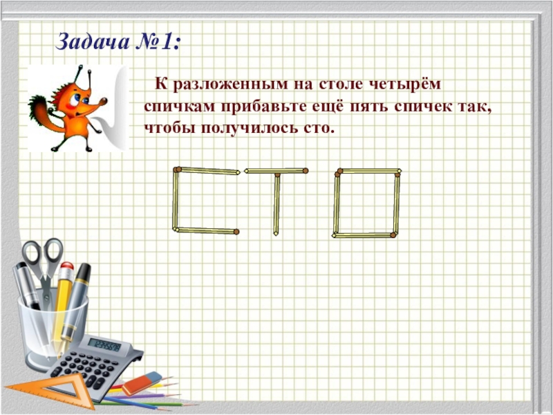 Задача №1: К разложенным на столе четырём спичкам прибавьте ещё пять спичек так, чтобы получилось сто.