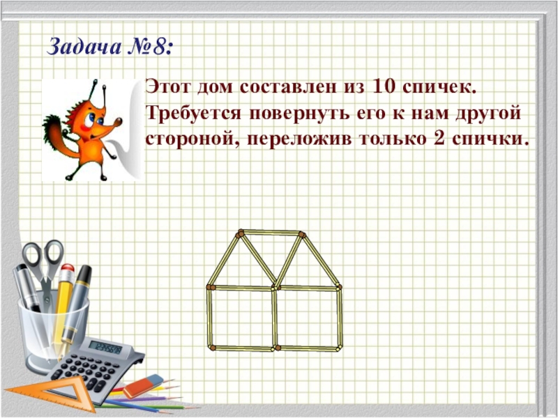 Задача №8:Этот дом составлен из 10 спичек. Требуется повернуть его к нам другой стороной, переложив только 2