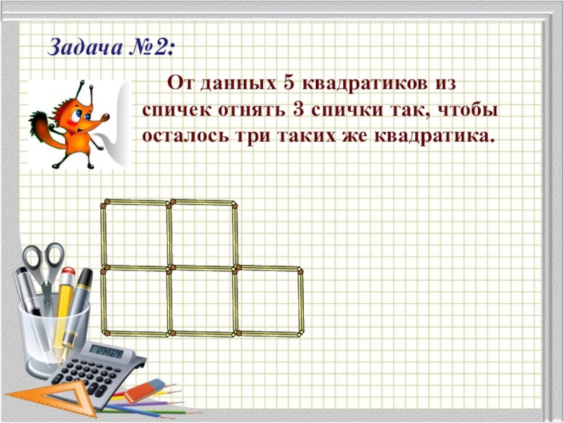 Задача №2:  От данных 5 квадратиков из спичек отнять 3 спички так, чтобы осталось три таких