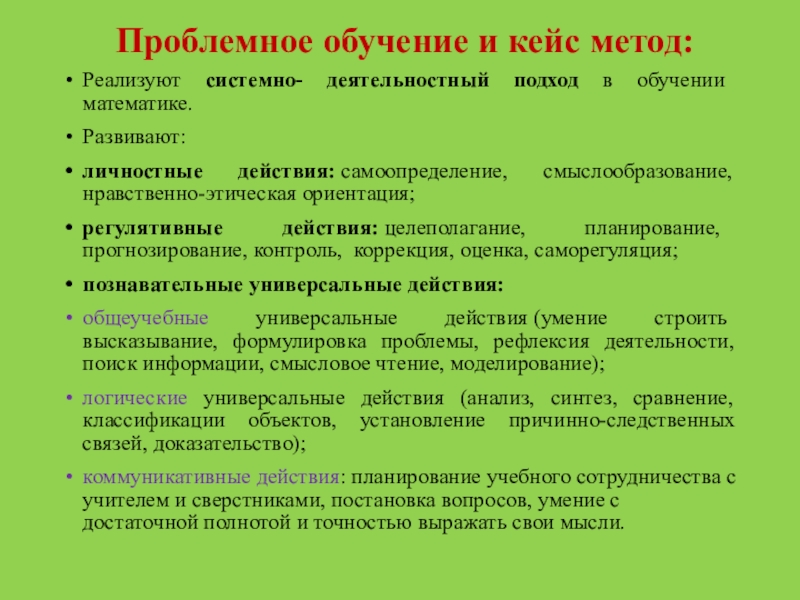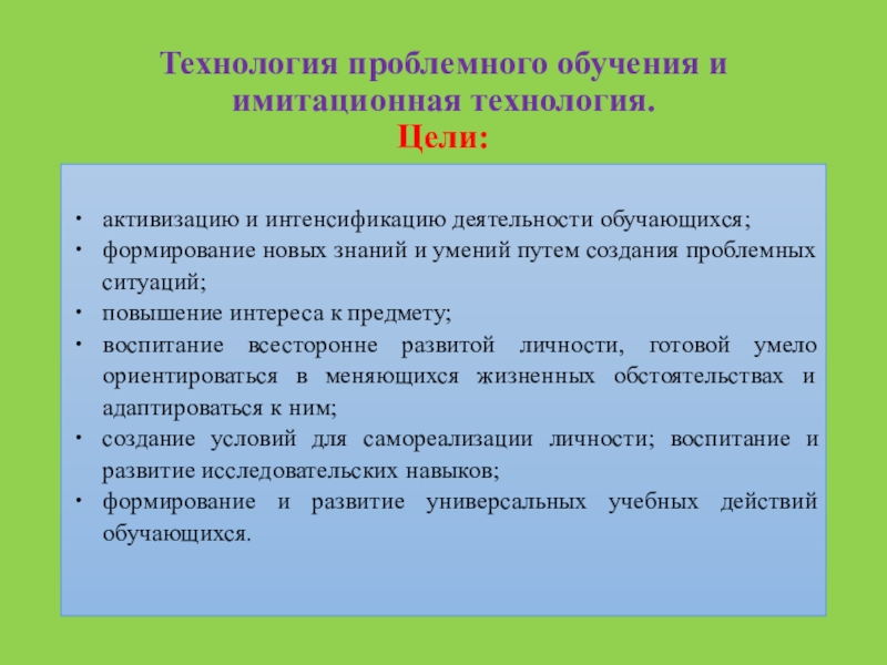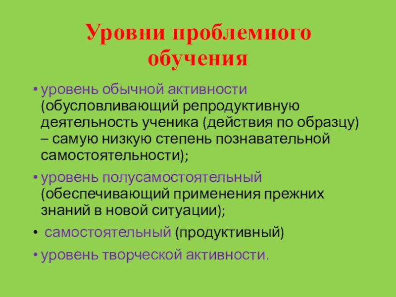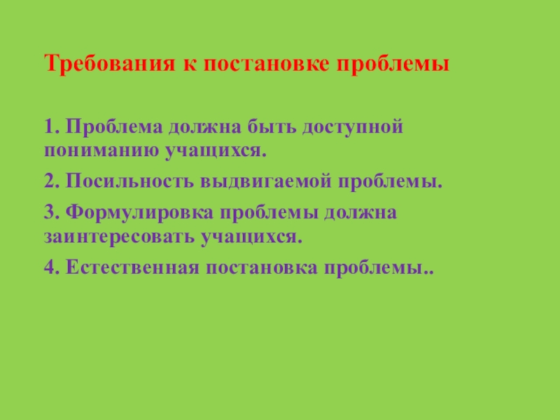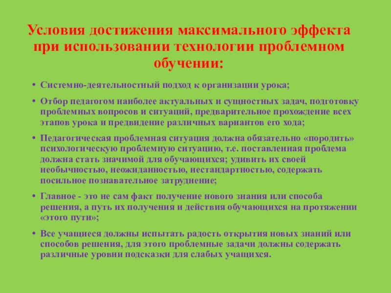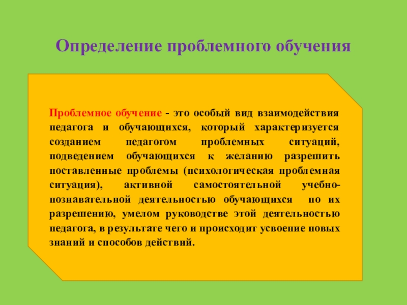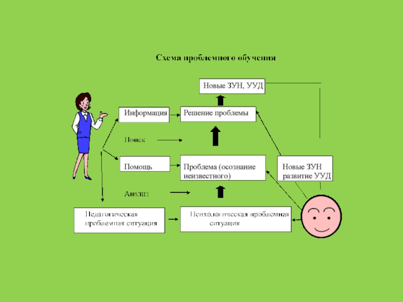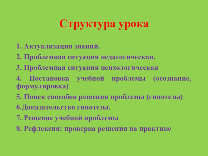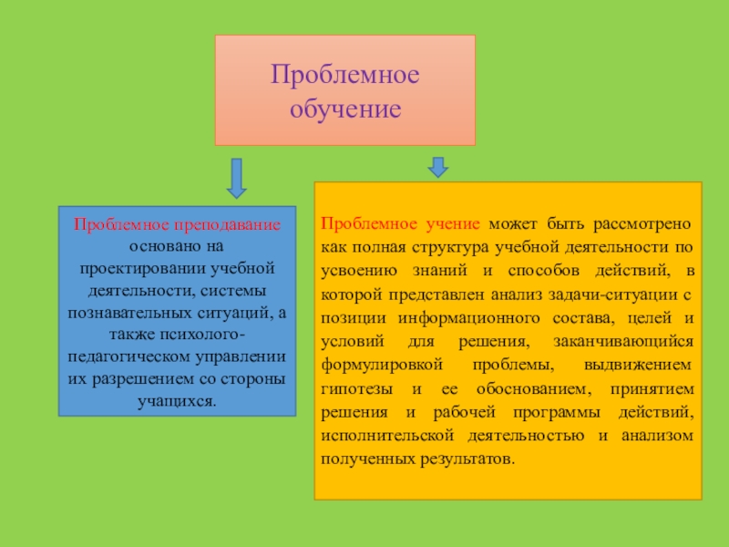 Проблемное учение может быть рассмотрено как полная структура учебной деятельности по усвоению знаний и способов действий, в которой представлен анализ задачи-ситуации с позиции информационного состава, целей и условий для решения, заканчивающийся формулировкой проблемы, выдвижением гипотезы и ее обоснованием, принятием решения и рабочей программы действий, исполнительской деятельностью и анализом полученных результатов.