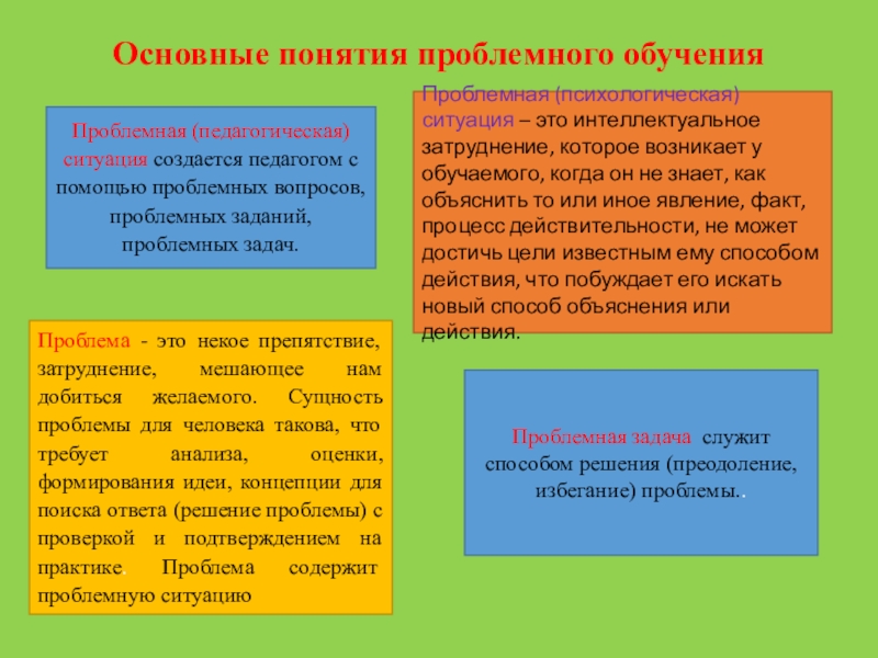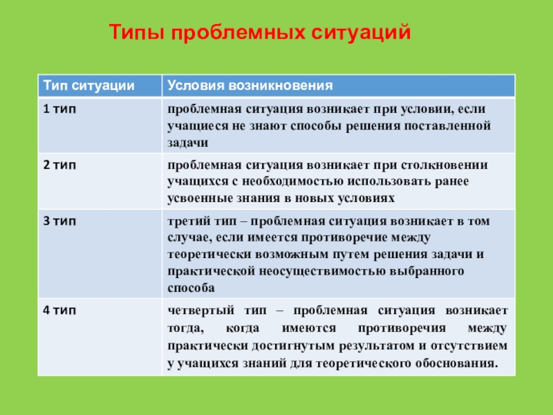 Проблемная (психологическая) ситуация – это интеллектуальное затруднение, которое возникает у обучаемого, когда он не знает, как объяснить то или иное явление, факт, процесс действительности, не может достичь цели известным ему способом действия, что побуждает его искать новый способ объяснения или действия.