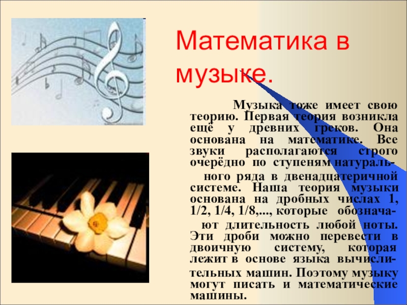 ного ряда в двенадцатеричной системе. Наша теория музыки основана на дробных числах 1, 1/2, 1/4, 1/8,..., которые обознача-