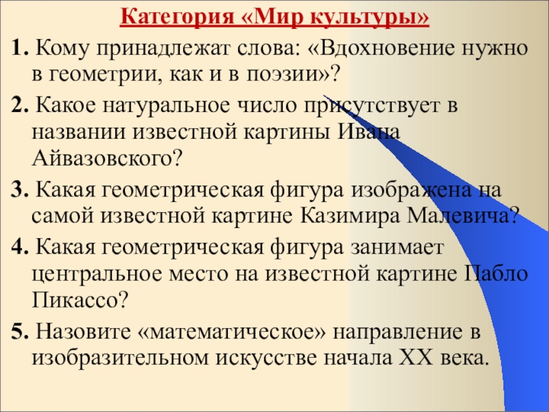 5. Назовите «математическое» направление в изобразительном искусстве начала ХХ века.