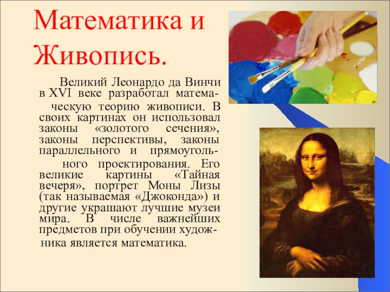 ного проектирования. Его великие картины «Тайная вечеря», портрет Моны Лизы (так называемая «Джоконда») и другие украшают лучшие музеи мира. B числе важнейших предметов при обучении худож-