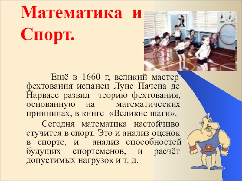 Сегодня математика настойчиво стучится в спорт. Это и анализ оценок в спорте, и анализ способностей будущих спортсменов, и расчёт допустимых нагрузок и т. д.