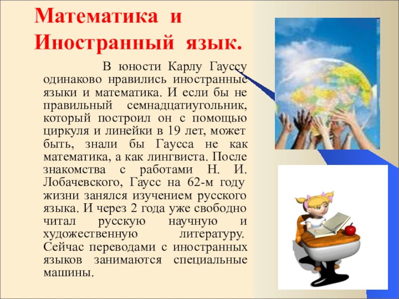 Карлу Гауссу одинаково нравились иностранные языки и математика. И если бы не правильный семнадцатиугольник, который построил он c помощью циркуля и линейки в 19 лет, может быть, знали бы Гaycca не как математика, a как лингвиста. После знакомства c работами H. И. Лобачевскогo, Гаусс на 62-м году жизни занялся изучением русского языка. И через 2 года уже свободно читал русскую научную и художественную литературу. Сейчас переводами c иностранных языков занимаются специальные машины.