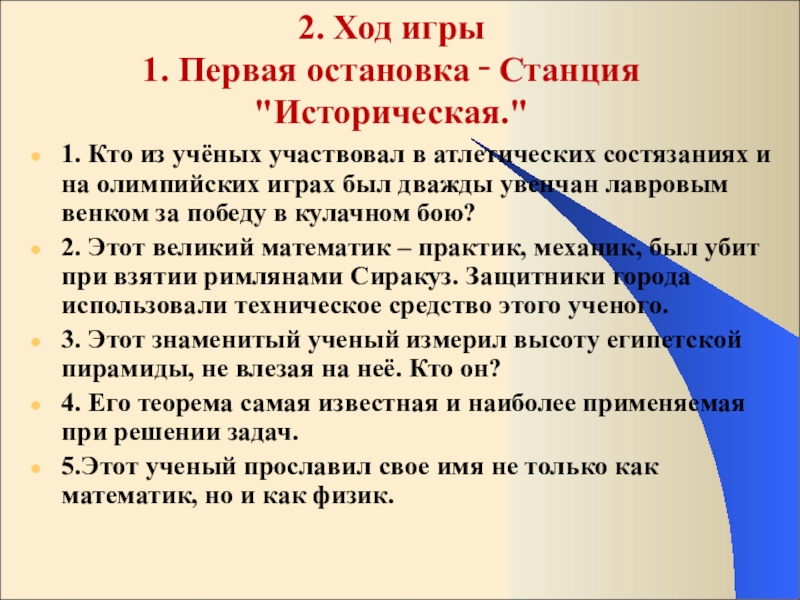 2. Этот великий математик – практик, механик, был убит при взятии римлянами Сиракуз. Защитники города использовали техническое средство этого ученого.