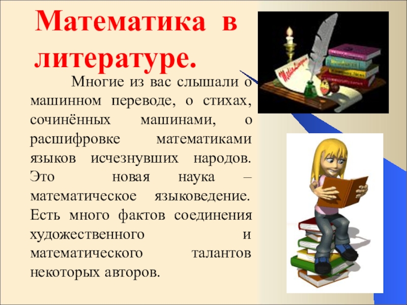 o машинном переводе, o стихах, сочинённых машинами, o расшифровке математиками языков исчезнувших народов. Это новая наука – математическое языковедение. Есть много фактов соединения художественного и математического талантов некоторых авторов.