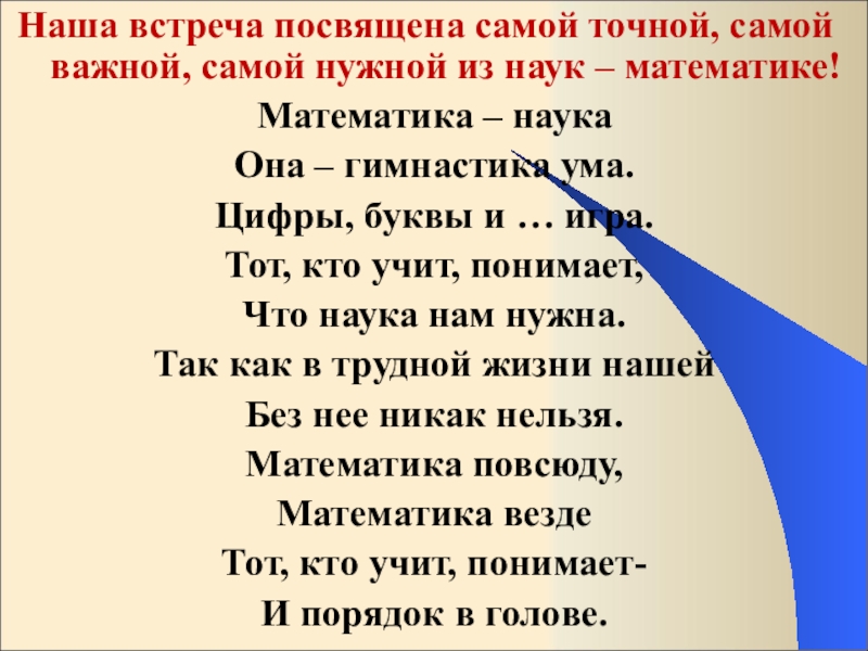 Слайд 2Наша встреча посвящена самой точной, самой важной, самой нужной из наук