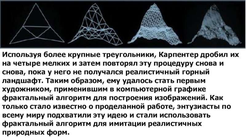 затем повторял эту процедуру снова и снова, пока у него не получался реалистичный горный ландшафт. Таким образом, ему удалось стать первым художником, применившим в компьютерной графике фрактальный алгоритм для построения изображений. Как только стало известно о проделанной работе, энтузиасты по всему миру подхватили эту идею и стали использовать фрактальный алгоритм для имитации реалистичных природных форм.