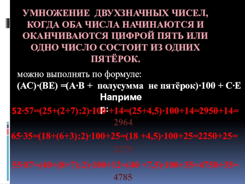55∙87=(40+(8+7):2)∙100+12=(40 +7,5)∙100+35=4750+35=