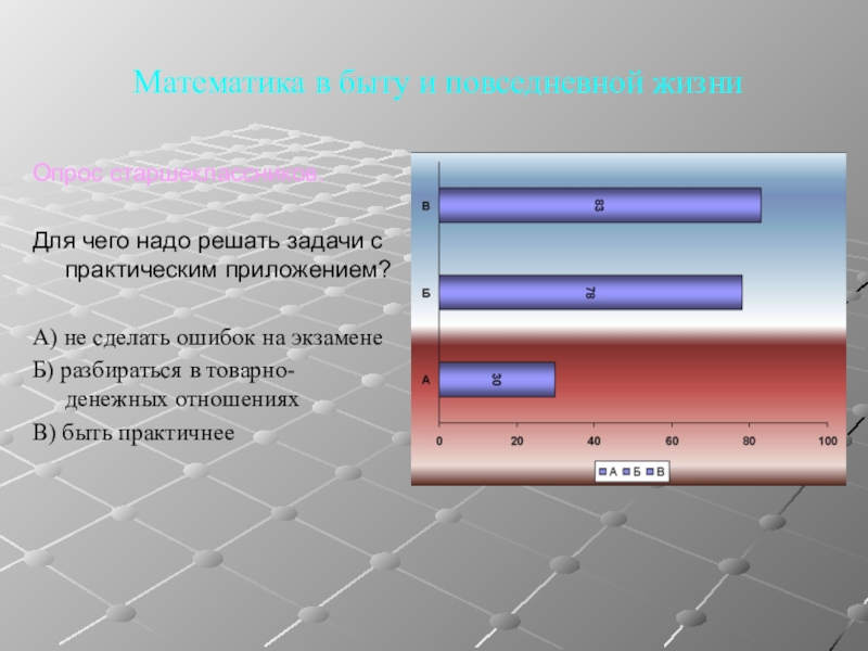 Это сайт презентаций, где можно хранить и обмениваться своими презентациями, докладами, проектами, шаблонами в формате PowerPoint с другими пользователями. Мы помогаем школьникам, студентам, учителям, преподавателям хранить и обмениваться учебными материалами.