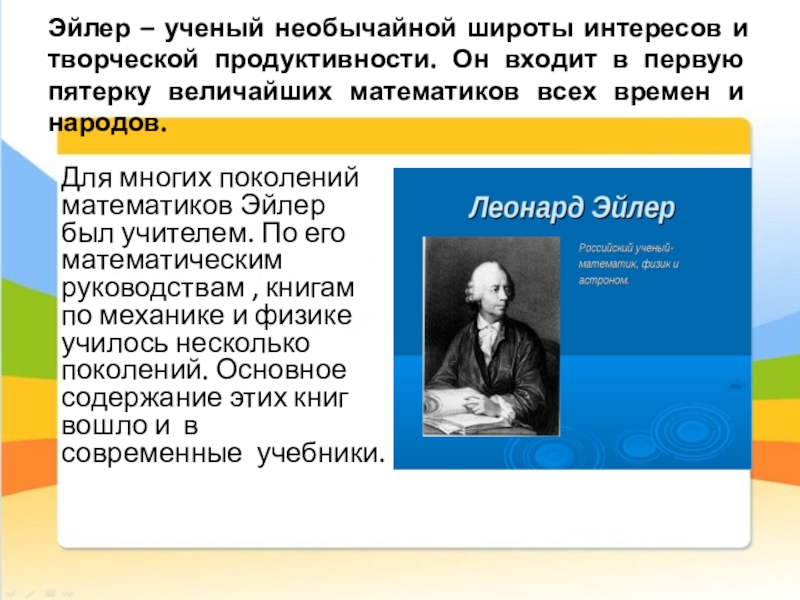 Для многих поколений математиков Эйлер был учителем. По его математическим руководствам , книгам по механике и физике училось несколько поколений. Основное содержание этих книг вошло и в современные учебники.