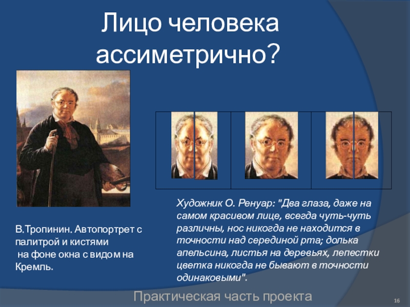 Художник О. Ренуар: "Два глаза, даже на самом красивом лице, всегда чуть-чуть различны, нос никогда не находится в точности над серединой рта; долька апельсина, листья на деревьях, лепестки цветка никогда не бывают в точности одинаковыми".