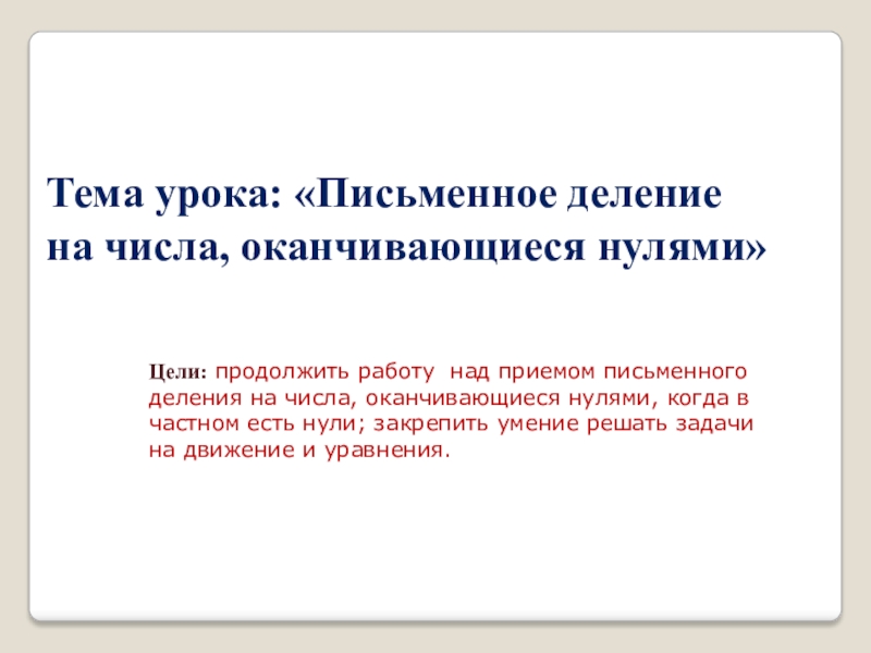 работу над приемом письменного деления на числа, оканчивающиеся нулями, когда в частном есть нули; закрепить умение решать задачи на движение и уравнения.