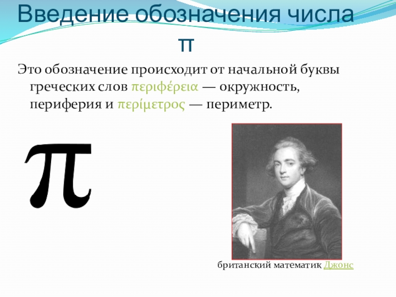 подходит для обозначения иррационального числа и происходит от греческого выражения «περιφέρεια», что в переводе «окружность» и в математике число П означает отношение длины к диаметру окружности. Число «пи» имеет древние корни. По утверждениям множества ученых точную дату происхождения числа П установить не возможно