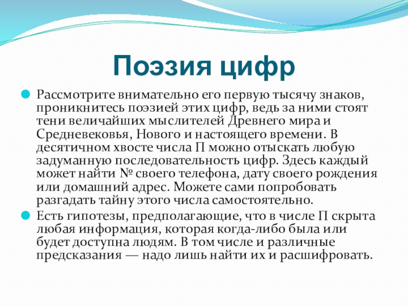 ведь за ними стоят тени величайших мыслителей Древнего мира и Средневековья, Нового и настоящего времени. В десятичном хвосте числа П можно отыскать любую задуманную последовательность цифр. Здесь каждый может найти № своего телефона, дату своего рождения или домашний адрес. Можете сами попробовать разгадать тайну этого числа самостоятельно.