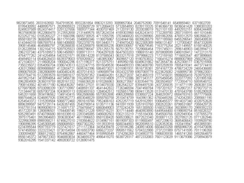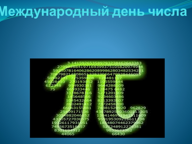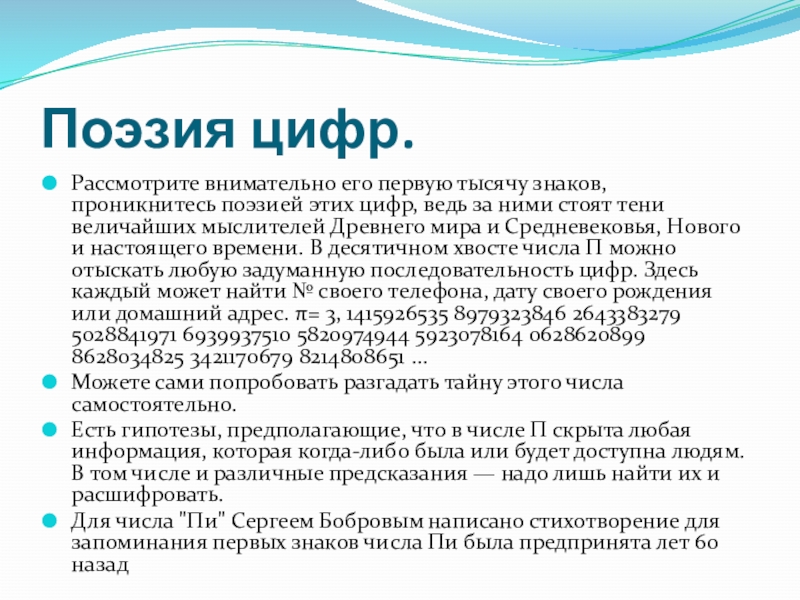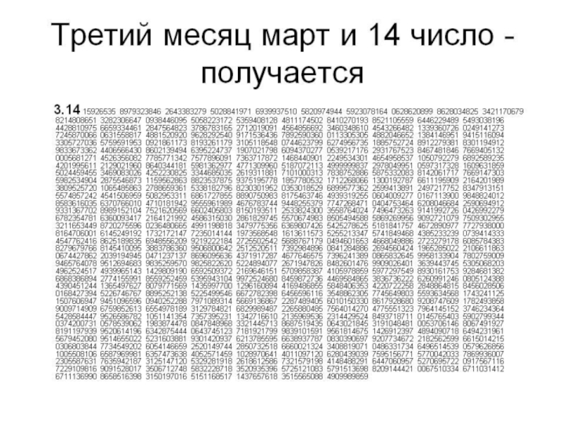 цифр, ведь за ними стоят тени величайших мыслителей Древнего мира и Средневековья, Нового и настоящего времени. В десятичном хвосте числа П можно отыскать любую задуманную последовательность цифр. Здесь каждый может найти № своего телефона, дату своего рождения или домашний адрес. π= 3, 1415926535 8979323846 2643383279 5028841971 6939937510 5820974944 5923078164 0628620899 8628034825 3421170679 8214808651 …