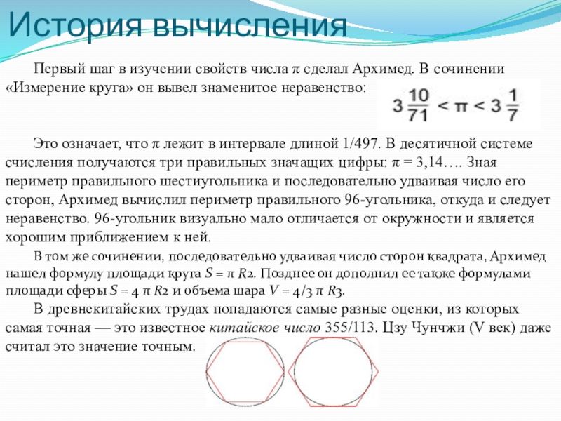 Это означает, что π лежит в интервале длиной 1/497. В десятичной системе счисления получаются три правильных значащих цифры: π = 3,14…. Зная периметр правильного шестиугольника и последовательно удваивая число его сторон, Архимед вычислил периметр правильного 96-угольника, откуда и следует неравенство. 96-угольник визуально мало отличается от окружности и является хорошим приближением к ней.