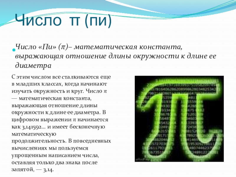 Число «Пи» (π)– математическая константа, выражающая отношение длины окружности к длине ее диаметра