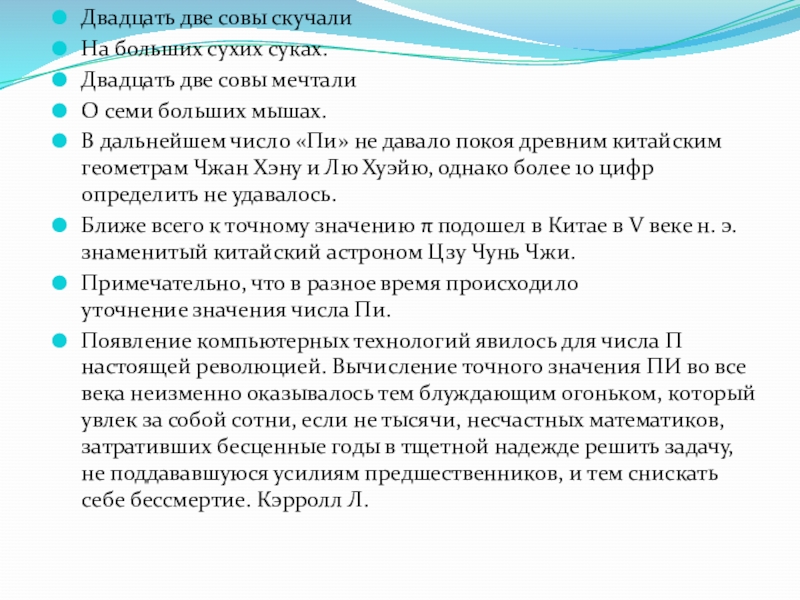 Появление компьютерных технологий явилось для числа П настоящей революцией. Вычисление точного значения ПИ во все века неизменно оказывалось тем блуждающим огоньком, который увлек за собой сотни, если не тысячи, несчастных математиков, затративших бесценные годы в тщетной надежде решить задачу, не поддававшуюся усилиям предшественников, и тем снискать себе бессмертие. Кэрролл Л.