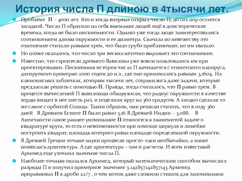 Наиболее точным оказался Архимед, который математическим способом вычислил разряды П и получил примерное значение 3.142857142857143 Архимед приравнивал П к дроби 22/7 , о чем потом даже сложили стишок для запоминания: