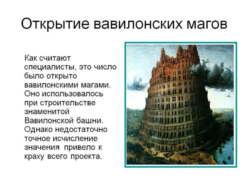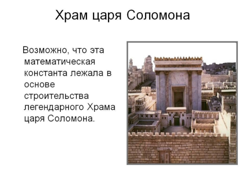 Известно, что строители древнего Вавилона уже вовсю пользовались им при проектировании. Письменная история числа П начинается с египетского папируса, датируемого примерно 2000 годом до н.э., где оно принималось равным 3,1604. На клинописных табличках, которым тысячи лет, сохранились даже задачи, которые предлагали решить с помощью П. Правда, тогда считалось, что П равно трем. В процессе вычислений П вавилонцы обнаружили, что радиус окружности в качестве хорды входит в нее шесть раз, и поделили круг на 360 градусов. А заодно сделали то же самое с орбитой Солнца. Таким образом, они решили считать, что в году 360 дней В Древнем Египте П было равно 3,16 В Древней Индии – 3,088. В Античности самое раннее упоминание П относится к знаменитой задаче о квадратуре круга, то есть о невозможности при помощи циркуля и линейки построить квадрат, площадь которого равна площади определенной окружности.