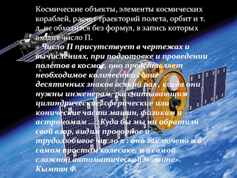« Число П присутствует в чертежах и вычислениях, при подготовке и проведении полетов в космос, оно представляет необходимое количество своих десятичных знаков всякий раз , когда они нужны инженерам, рассчитывающим цилиндрические, сферические или конические части машин, физикам и астрономам … . Куда бы мы ни обратили свой взор, видим проворное и трудолюбивое число : оно заключено и в самом простом колесике, и в самой сложной автоматической машине».