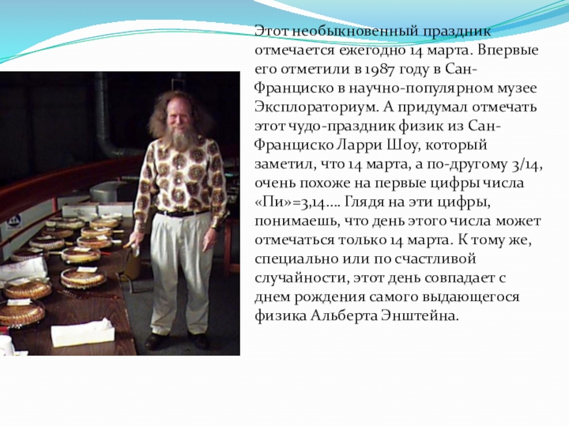 1987 году в Сан-Франциско в научно-популярном музее Эксплораториум. А придумал отмечать этот чудо-праздник физик из Сан-Франциско Ларри Шоу, который заметил, что 14 марта, а по-другому 3/14, очень похоже на первые цифры числа «Пи»=3,14…. Глядя на эти цифры, понимаешь, что день этого числа может отмечаться только 14 марта. К тому же, специально или по счастливой случайности, этот день совпадает с днем рождения самого выдающегося физика Альберта Энштейна.