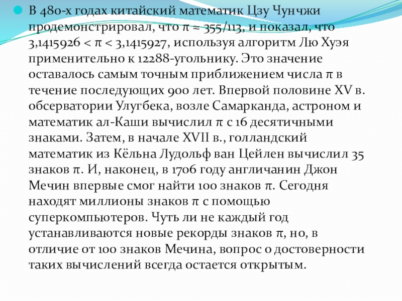 355/113, и показал, что 3,1415926 < π < 3,1415927, используя алгоритм Лю Хуэя применительно к 12288-угольнику. Это значение оставалось самым точным приближением числа π в течение последующих 900 лет. Впервой половине XV в. обсерватории Улугбека, возле Самарканда, астроном и математик ал-Каши вычислил π с 16 десятичными знаками. Затем, в начале XVII в., голландский математик из Кёльна Лудольф ван Цейлен вычислил 35 знаков π. И, наконец, в 1706 году англичанин Джон Мечин впервые смог найти 100 знаков π. Сегодня находят миллионы знаков π с помощью суперкомпьютеров. Чуть ли не каждый год устанавливаются новые рекорды знаков π, но, в отличие от 100 знаков Мечина, вопрос о достоверности таких вычислений всегда остается открытым.