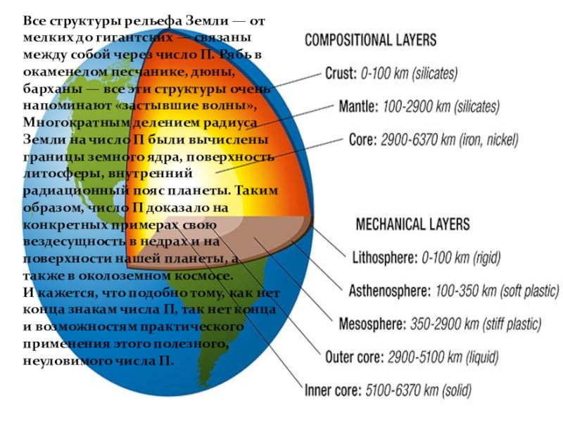 между собой через число П. Рябь в окаменелом песчанике, дюны, барханы — все эти структуры очень напоминают «застывшие волны», Многократным делением радиуса Земли на число П были вычислены границы земного ядра, поверхность литосферы, внутренний радиационный пояс планеты. Таким образом, число П доказало на конкретных примерах свою вездесущность в недрах и на поверхности нашей планеты, а также в околоземном космосе.