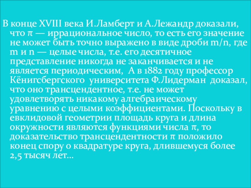 число, то есть его значение не может быть точно выражено в виде дроби m/n, где m и n — целые числа, т.е. его десятичное представление никогда не заканчивается и не является периодическим, А в 1882 году профессор Кёнигсбергского университета Ф.Лидерман доказал, что оно трансцендентное, т.е. не может удовлетворять никакому алгебраическому уравнению с целыми коэффициентами. Поскольку в евклидовой геометрии площадь круга и длина окружности являются функциями числа π, то доказательство трансцендентности π положило конец спору о квадратуре круга, длившемуся более 2,5 тысяч лет…