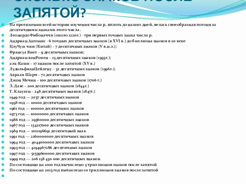 до наших дней, велась своеобразная погоня за десятичными знаками этого числа.