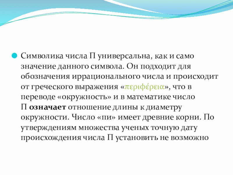 Слайд 15Символика числа П универсальна, как и само значение данного символа. Он