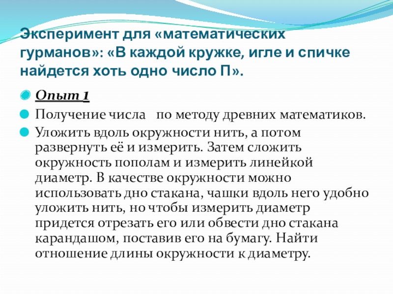 Уложить вдоль окружности нить, а потом развернуть её и измерить. Затем сложить окружность пополам и измерить линейкой диаметр. В качестве окружности можно использовать дно стакана, чашки вдоль него удобно уложить нить, но чтобы измерить диаметр придется отрезать его или обвести дно стакана карандашом, поставив его на бумагу. Найти отношение длины окружности к диаметру.