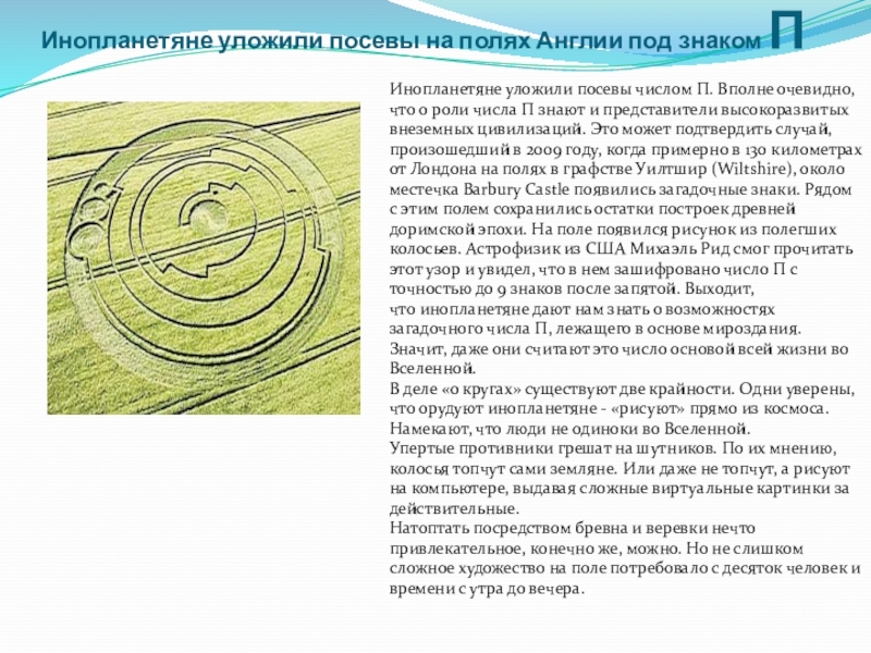 числом П. Вполне очевидно, что о роли числа П знают и представители высокоразвитых внеземных цивилизаций. Это может подтвердить случай, произошедший в 2009 году, когда примерно в 130 километрах от Лондона на полях в графстве Уилтшир (Wiltshire), около местечка Barbury Castle появились загадочные знаки. Рядом с этим полем сохранились остатки построек древней доримской эпохи. На поле появился рисунок из полегших колосьев. Астрофизик из США Михаэль Рид смог прочитать этот узор и увидел, что в нем зашифровано число П с точностью до 9 знаков после запятой. Выходит, что инопланетяне дают нам знать о возможностях загадочного числа П, лежащего в основе мироздания. Значит, даже они считают это число основой всей жизни во Вселенной.