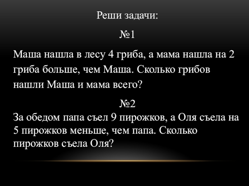 Реши задачи:№1Маша нашла в лесу 4 гриба, а мама нашла на 2 гриба больше, чем Маша. Сколько