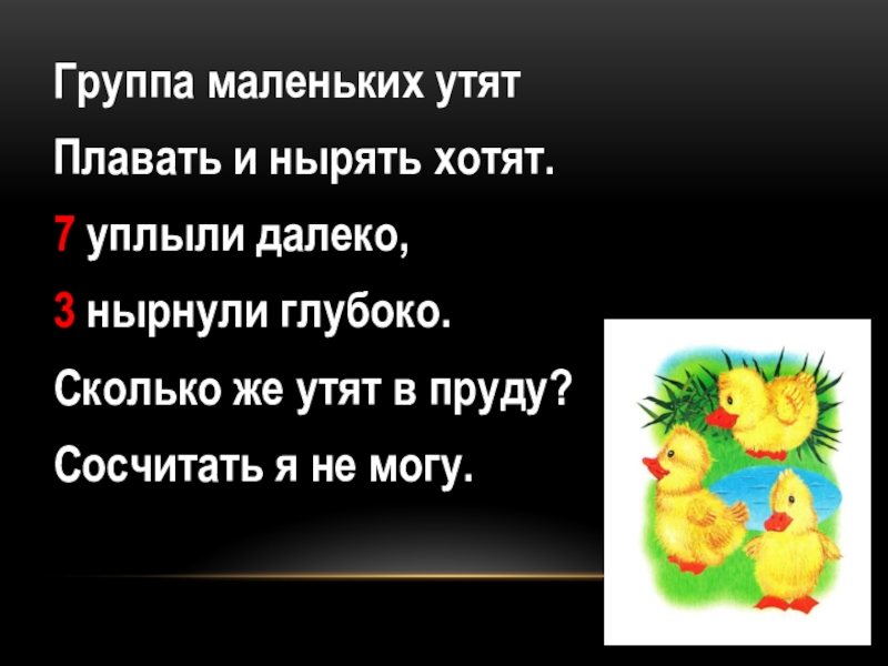 Группа маленьких утятПлавать и нырять хотят.7 уплыли далеко, 3 нырнули глубоко.Сколько же утят в пруду?Сосчитать я не