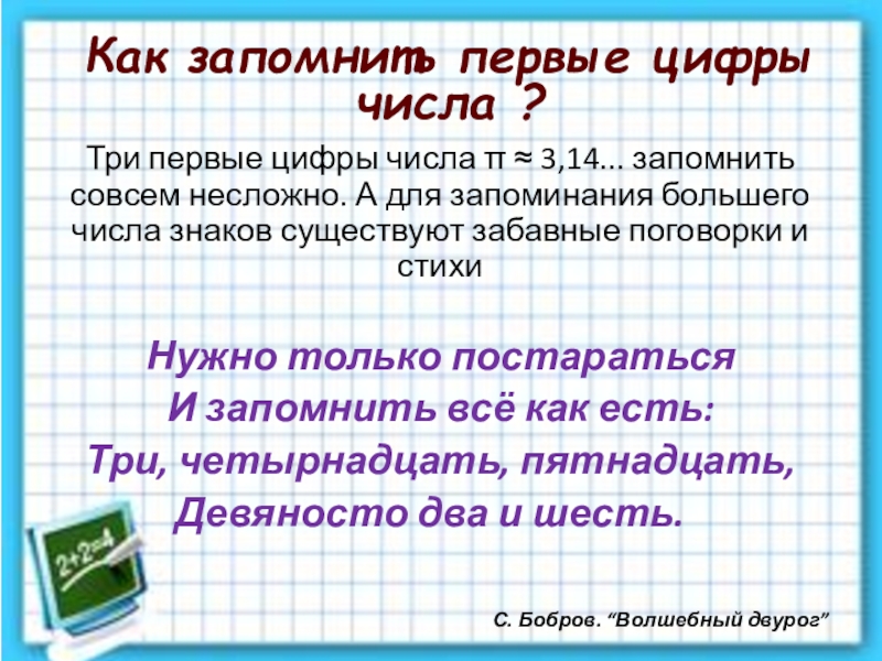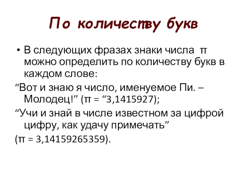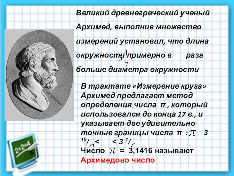 В трактате «Измерение круга» Архимед предлагает метод определения числа π , который использовался до конца 17 в., и указывает две удивительно точные границы числа π : 3 10/71< < 3 1/7.