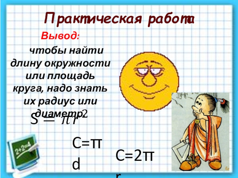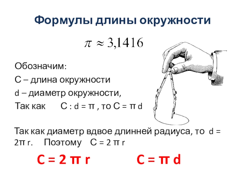 Так как диаметр вдвое длинней радиуса, то d = 2π r. Поэтому С = 2 π r