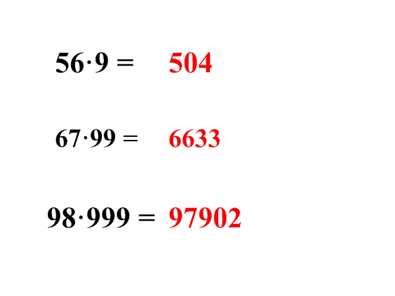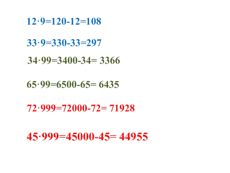 12·9=120-12=10833·9=330-33=29734·99=3400-34= 336665·99=6500-65= 643545·999=45000-45= 4495572·999=72000-72= 71928