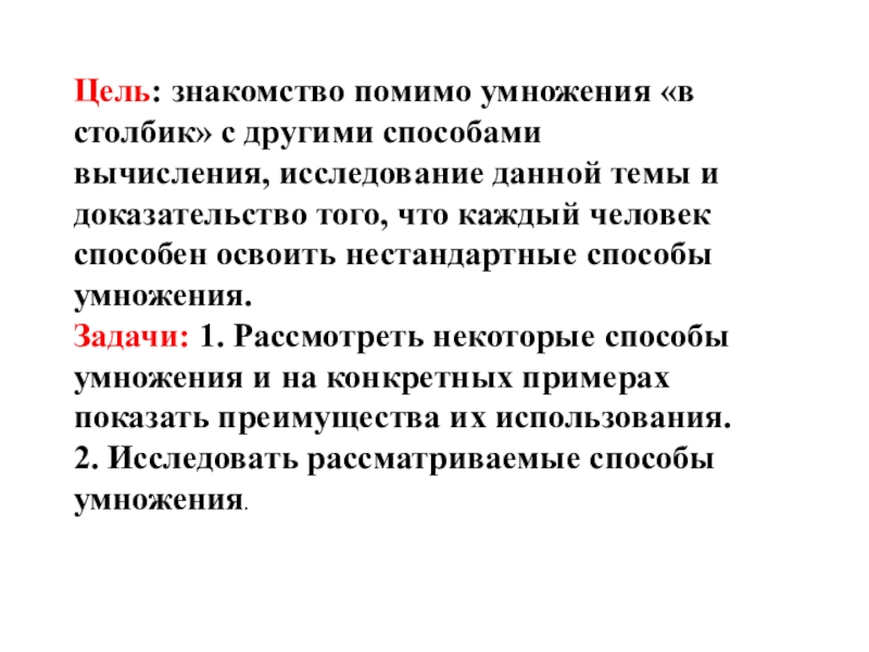Цель: знакомство помимо умножения «в столбик» с другими способами вычисления, исследование данной темы и доказательство того, что каждый человек способен освоить нестандартные способы умножения.Задачи: 1. Рассмотреть некоторые способы умножения и на конкретных примерах показать преимущества их