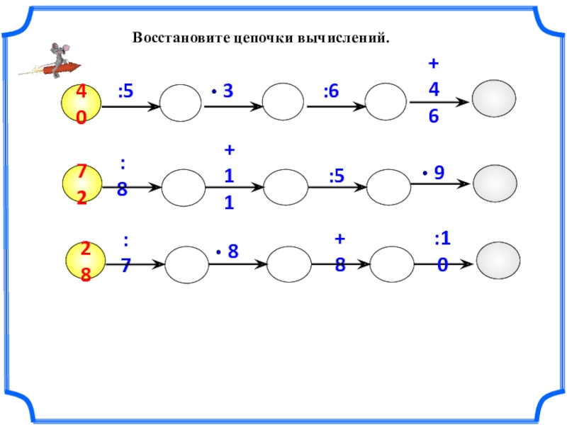 Восстановите цепочки вычислений.  40:8:5+11+4672:6:5:7+828:10