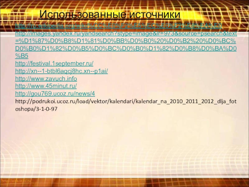 Использованные источникиhttp://ru.wikipedia.org/wiki/%CC%E0%F2%E5%EC%E0%F2%E8%EA%E0http://images.yandex.ru/yandsearch?stype=image&lr=973&source=psearch&text=%D1%87%D0%B8%D1%81%D0%BB%D0%B0%20%D0%B2%20%D0%BC%D0%B0%D1%82%D0%B5%D0%BC%D0%B0%D1%82%D0%B8%D0%BA%D0%B5http://festival.1september.ru/http://xn--1-btbl6aqcj8hc.xn--p1ai/http://www.zavuch.infohttp://www.45minut.ru/http://gou769.ucoz.ru/news/4http://podrukoi.ucoz.ru/load/vektor/kalendari/kalendar_na_2010_2011_2012_dlja_fotoshopa/3-1-0-97