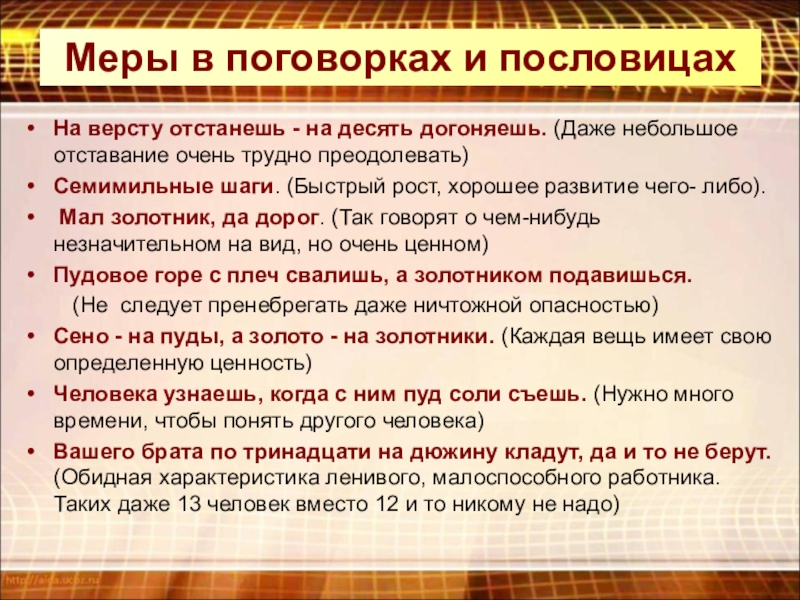 Меры в поговорках и пословицахНа версту отстанешь - на десять догоняешь. (Даже небольшое отставание очень трудно преодолевать)