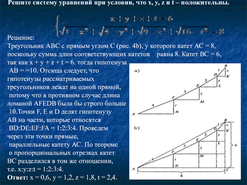 По теореме, обратной теореме Пифагора , числах, у и 3 являются соответственно длинами катетов и гипотенузы треугольника АВD с прямым углом D. Из 2-го уравнения у, z и 4 так же есть
