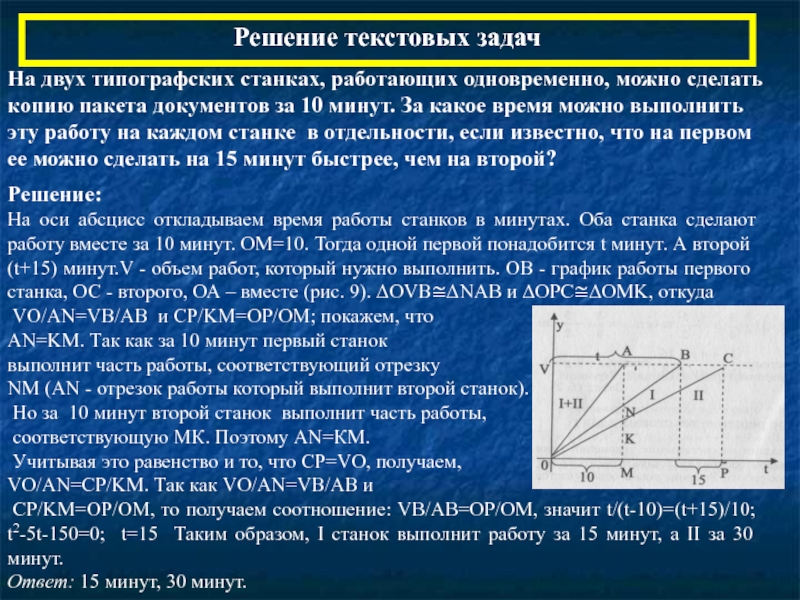 На оси абсцисс откладываем время работы станков в минутах. Оба станка сделают работу вместе за 10 минут. ОМ=10. Тогда одной первой понадобится t минут. А второй (t+15) минут.V - объем работ, который нужно выполнить. ОВ - график работы первого станка, ОС - второго, ОА – вместе (рис. 9). ΔОVB≅ΔNAB и ΔOPС≅ΔOMK, откуда