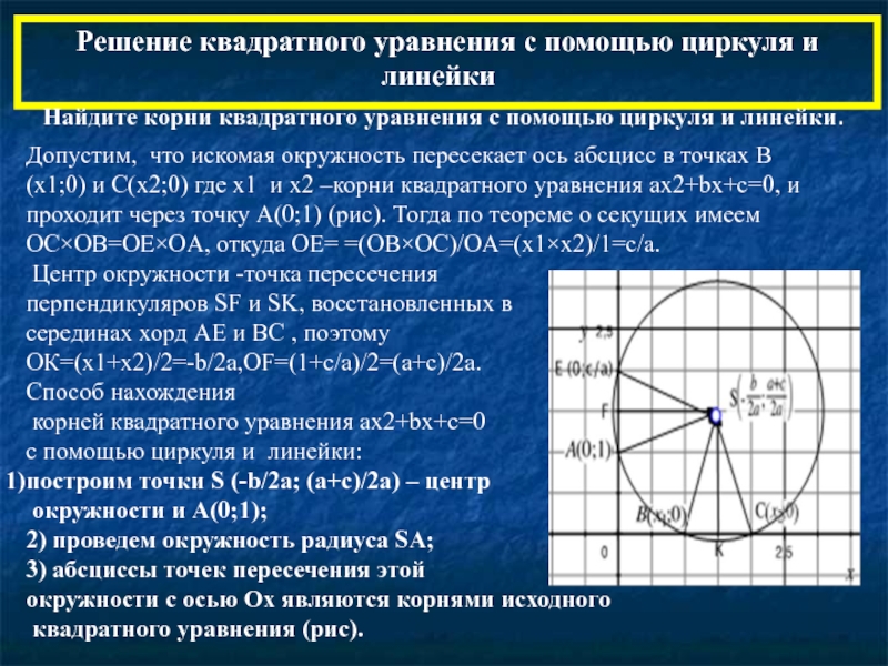 Допустим, что искомая окружность пересекает ось абсцисс в точках В(х1;0) и С(х2;0) где х1 и х2 –корни квадратного уравнения ax2+bx+c=0, и проходит через точку А(0;1) (рис). Тогда по теореме о секущих имеем OС×OВ=OЕ×OА, откуда OЕ= =(OB×OС)/OA=(x1×x2)/1=c/a.