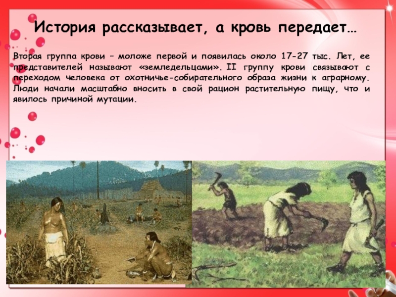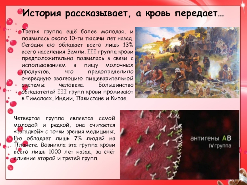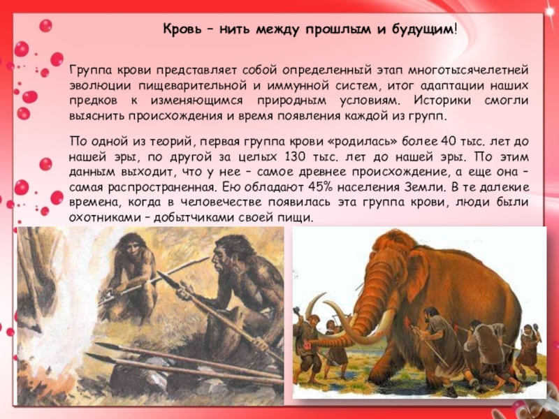 По одной из теорий, первая группа крови «родилась» более 40 тыс. лет до нашей эры, по другой за целых 130 тыс. лет до нашей эры. По этим данным выходит, что у нее – самое древнее происхождение, а еще она – самая распространенная. Ею обладают 45% населения Земли. В те далекие времена, когда в человечестве появилась эта группа крови, люди были охотниками – добытчиками своей пищи.